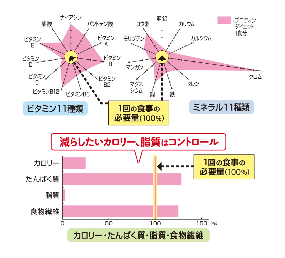 1回の食事に必要な※2ビタミン11種類、ミネラル11種類に加えて、たんぱく質、食物繊維も充実配合! カロリー制限時に不足しやすい栄養素をきちんと摂取でき、健康的なダイエットをサポートします。