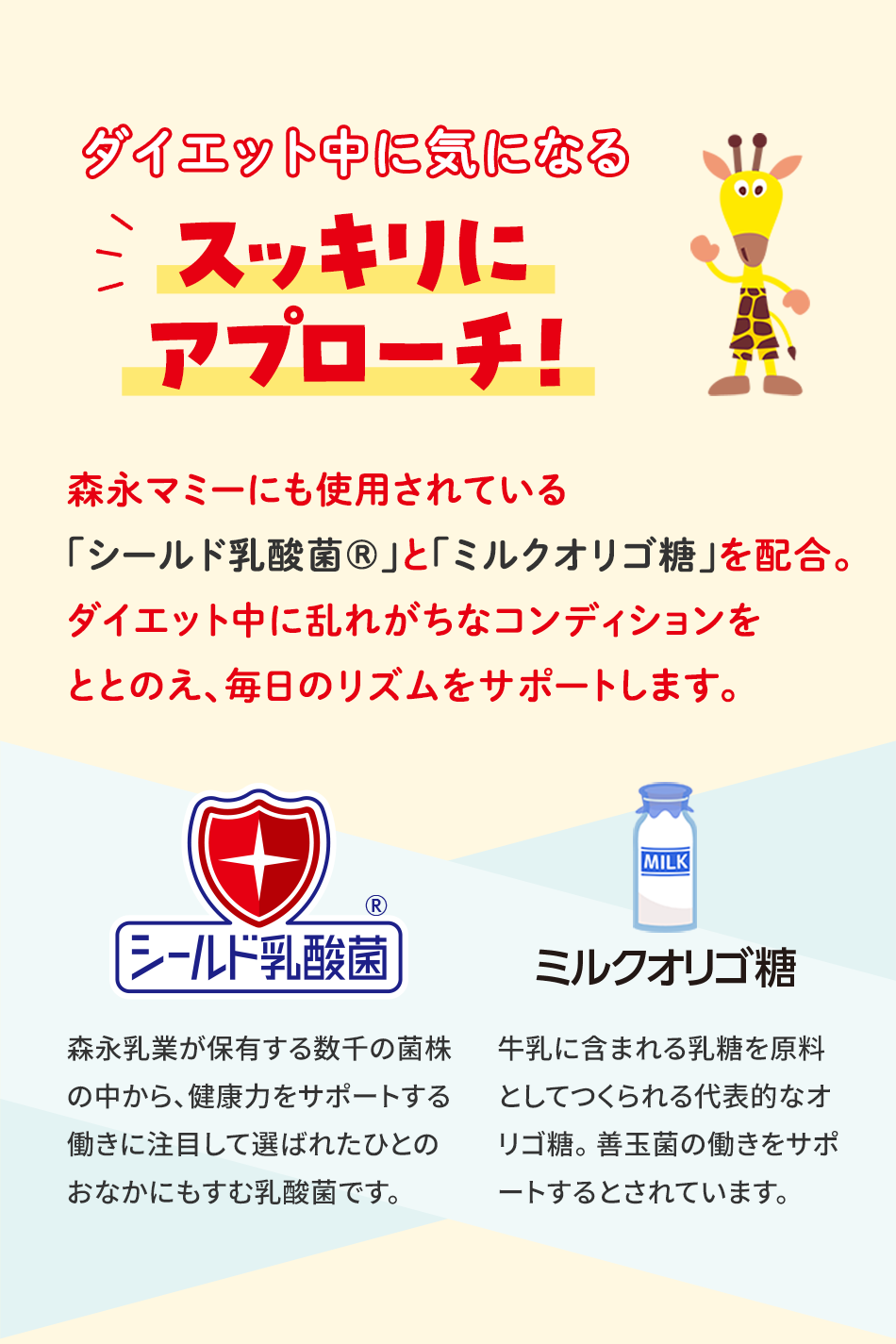 森永乳業の<シールド乳酸菌®※1>、そして<ミルクオリゴ糖※2>入り