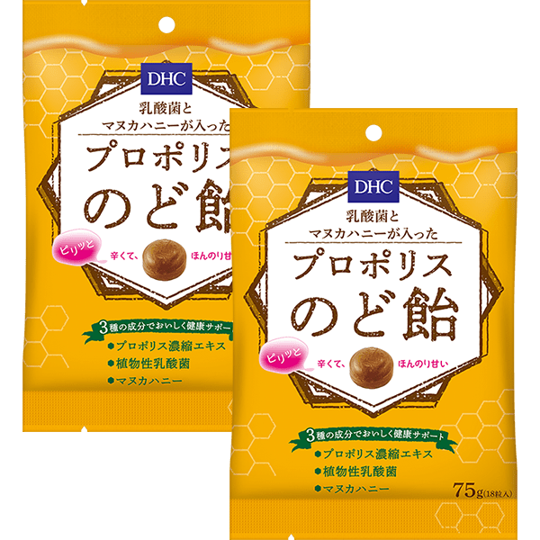 ミツバチが、植物から集めた樹液や花粉等をもとに作り出すプロポリスは、健康の維持に役立つとされています。『DHC乳酸菌とマヌカハニーが入ったプロポリスのど飴』は、そんなプロポリスの濃縮エキスを1粒あたり25mg配合。さらに植物性乳酸菌とマヌカハニーを加え、おいしく健康をサポートします。