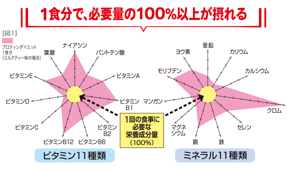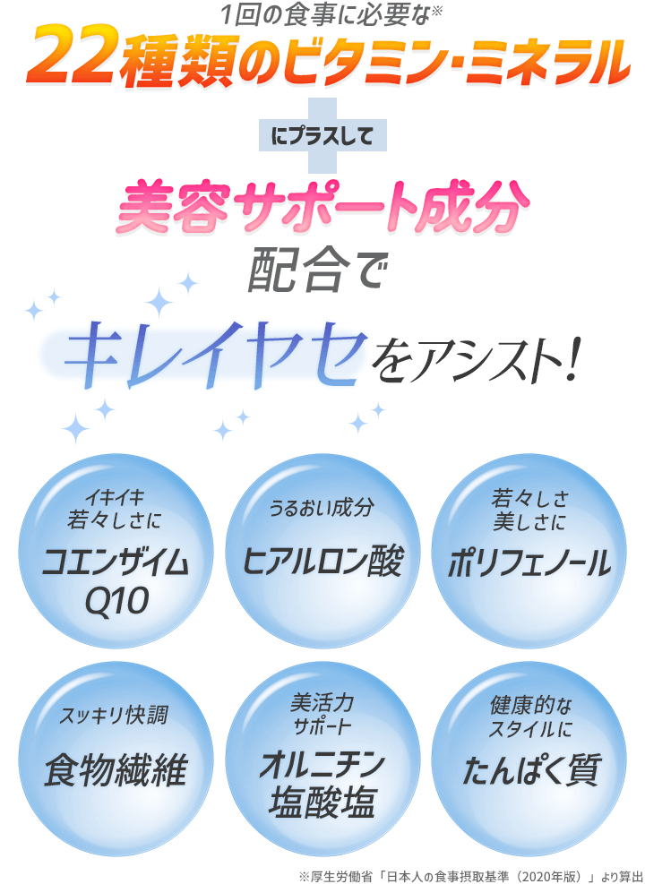 1回の食事に必要な※2ビタミン11種類、ミネラル11種類に加えて、たんぱく質、食物繊維も充実配合! カロリー制限時に不足しやすい栄養素をきちんと摂取でき、健康的なダイエットをサポートします。