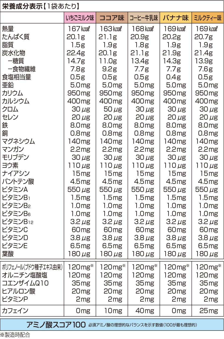 ◆ココア味:大豆蛋白(国内製造)、乳蛋白、難消化性デキストリン、デキストリン、脱脂ココアパウダー(オランダ産100%)、果糖、粉末油脂、ドロマイト、カラメルシラップパウダー(カラメルシラップ、デキストリン)、パン酵母、オルニチン塩酸塩、ブドウ種子エキス末、コエンザイムQ10/クエン酸K、カラメル色素、塩化K、香料、増粘剤(キサンタンガム)、乳化剤、甘味料(アスパルテーム・L-フェニルアラニン化合物、スクラロース、アセスルファムK)、V.C、ピロリン酸鉄、ヒアルロン酸、ナイアシン、V.E、パントテン酸Ca、V.B1、ヘスペリジン、V.B2、V.B6、V.A、葉酸、V.D、V.B12