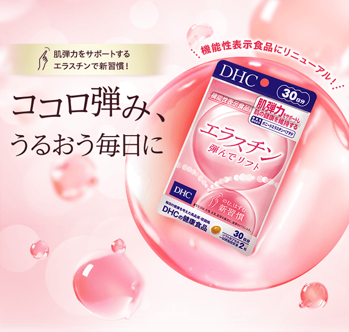 『エラスチン 弾んでリフト』は、肌の弾力を維持し、肌のうるおいを守ることで肌の健康維持に役立つことが報告されている、ボニートエラスチンペプチドを配合した機能性表示食品です。