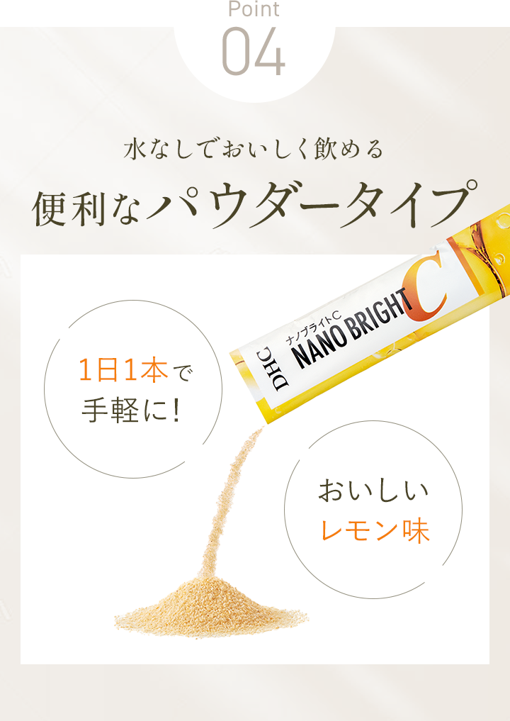 『ナノブライトC』は、ビタミンCを効率的に吸収できるよう、体内への届け方にこだわり超吸収リポソームを採用したビューティサプリメント。水なしで飲めるおいしいレモン味のパウダータイプです。