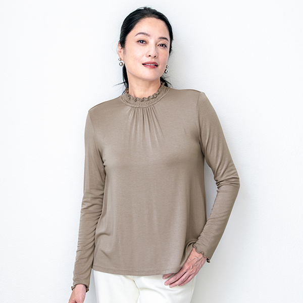 アルガンオイル配合で保湿機能のあるカットソー。アクセントになるシャーリングネックデザインで、首元をカバーしながら華やかな印象をつくります。 シンプルなので、重ね着もしやすいです。