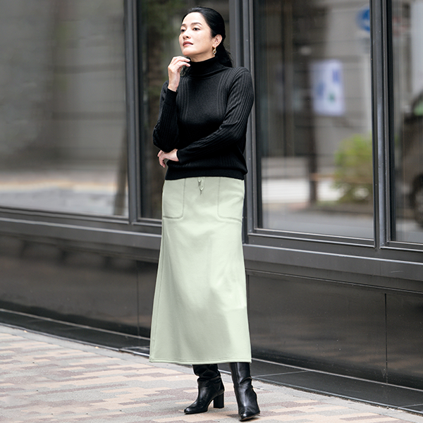 • 着用色:スモーキーグリーン<br>すっきりしたAラインはスタイルアップ効果あり