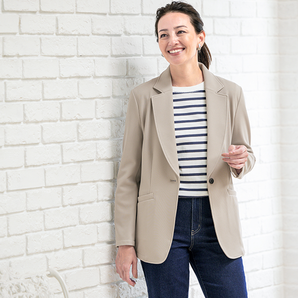 厚みがあるツイルのジャージー素材です。大人の女性に着てもらいたい上質な生地を使った品の良いジャケットです。伸びる素材で動きやすいく、腕を上げるのもストレスに感じませんでした。Sサイズでバッチリです。衿付きで丈が少し長めな今っぽいデザインがカッコ良いです。