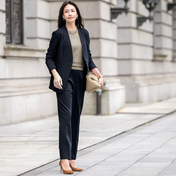 厚みがあるツイルのジャージー素材です。大人の女性に着てもらいたい上質な生地を使った品の良いパンツです。伸びる素材で動きやすい。しゃがんでも安心のお尻まわりです。155cmの私には股下が少し長く動画は6cmのヒールを合わせました。