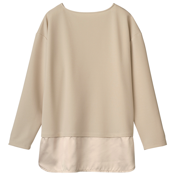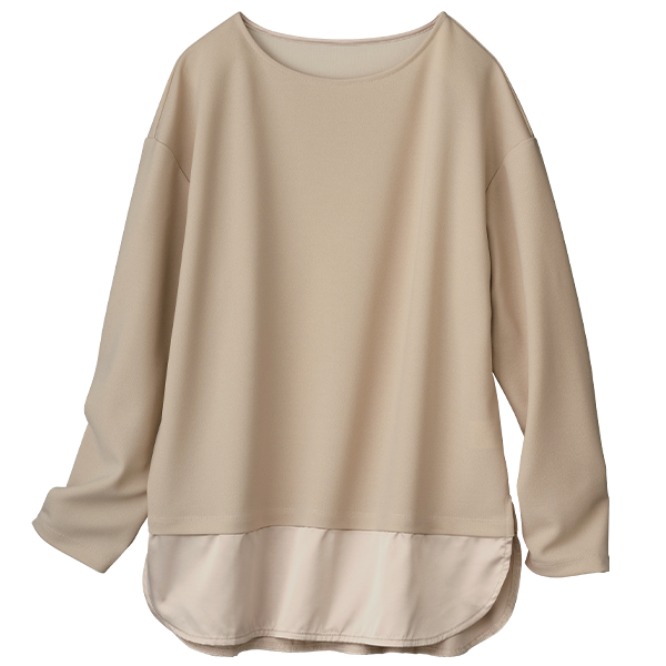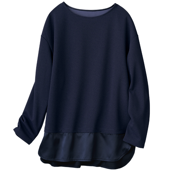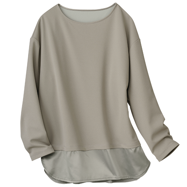 身頃に透け感はなく、Tシャツに上品さを加えたような縦横ストレッチ生地です。この身長で袖丈・着丈は許容内です。さらさらとした肌触りで、着心地は良いです。裾の切り替えサテンは光沢があり、上品さがあります。これ1枚で重ね着風に見える楽チンシャツ、色違いで揃えてもお買い得!