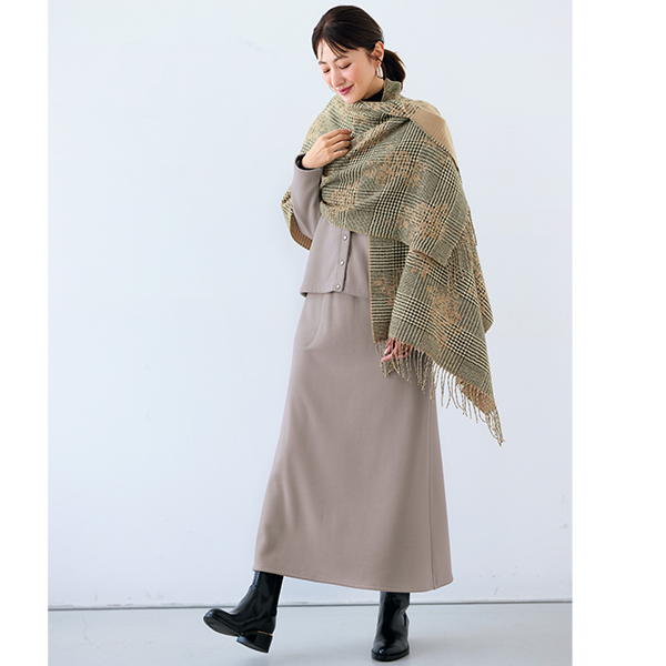 大人も使いやすいグレンチェックとフラワー柄のジャカード織りが可愛い、大判サイズのエレガントなストール。さっと巻くのにちょうどよいストール幅とアウターに合わせやすい色調で、コーデのアクセントとしてデイリーに活躍します。