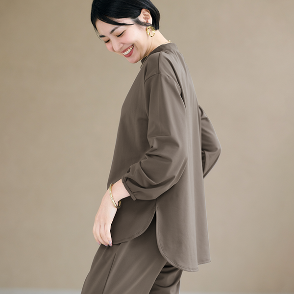 ストレッチ性に富んだジャージー素材で、セラミック配合の暖かさ、素肌に着ても心地よい肌触りです。Lで裄丈は75cmほどになるので、袖丈も許容内です。横にゆとりを感じます。裾は出してもインしても使えるデザインなので、パンツにもスカートに合わせやすいと思います。
