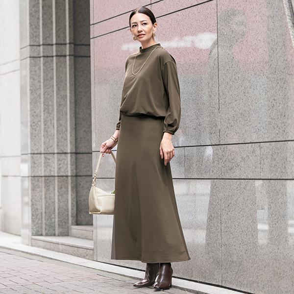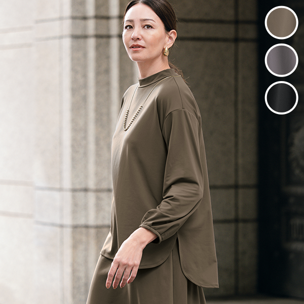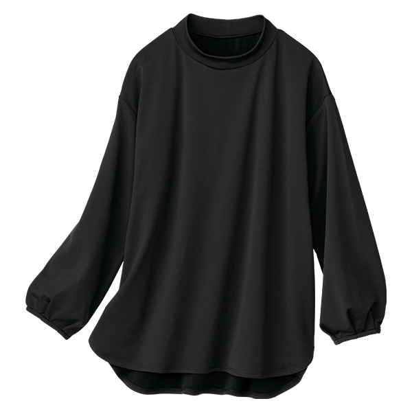 ストレッチ性に富んだジャージー素材で、セラミック配合の暖かさ、素肌に着ても心地よい肌触りです。Lで裄丈は75cmほどになるので、袖丈も許容内です。横にゆとりを感じます。裾は出してもインしても使えるデザインなので、パンツにもスカートに合わせやすいと思います。