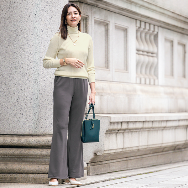 表はきれいできちんと感のあるなめらかな表面感で上品でありつつ裏は起毛がかっていてとてもあたたかいです!ストンと落ち感のある生地ですが、着てみると裾は若干フレアなシルエットになりました。丈は長めだったので159cmくらいの方はMサイズだと厚底かヒールを履くのがおすすめです。