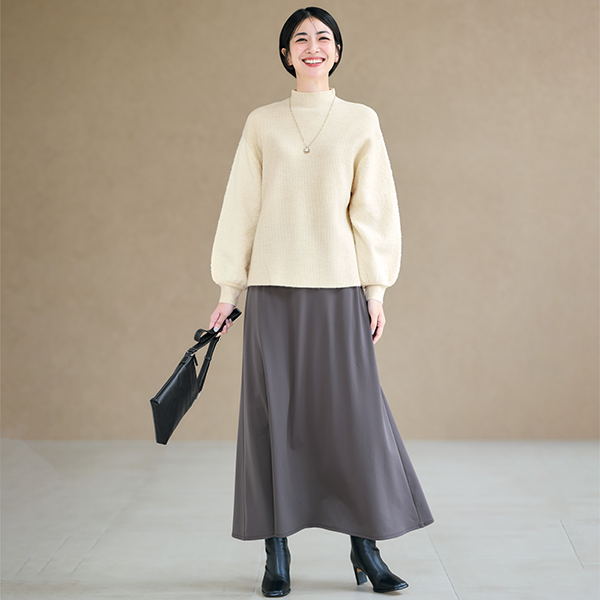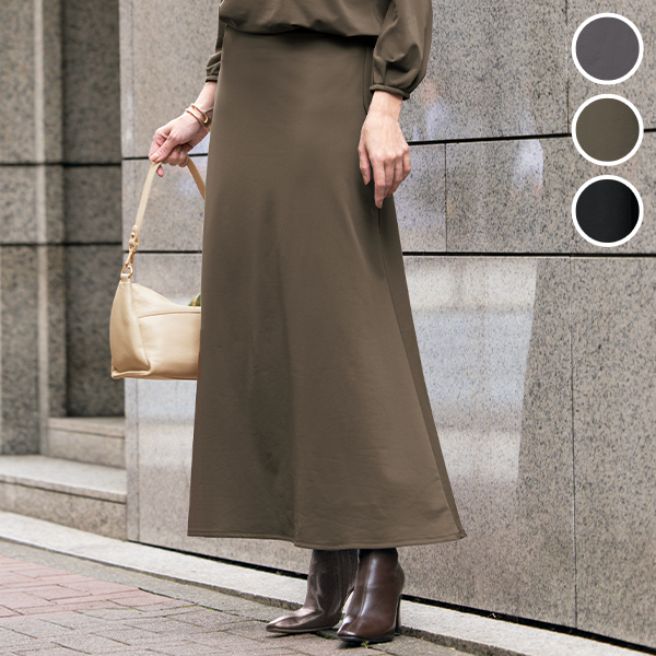 表はなめらか、裏は起毛がかった、もっちりした素材感です。Sサイズでちょうど良いですが丈はくるぶし上まであるので、スッキリ履きたい時はヒールを合わせたいです。良く伸びる素材なので、歩きやすくストレスは感じませんでした。少しフレアーになったシルエットがエレガントなスカートです。