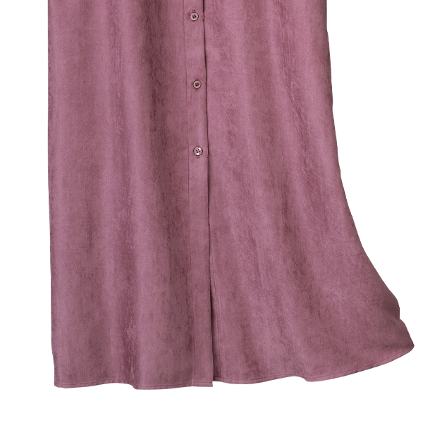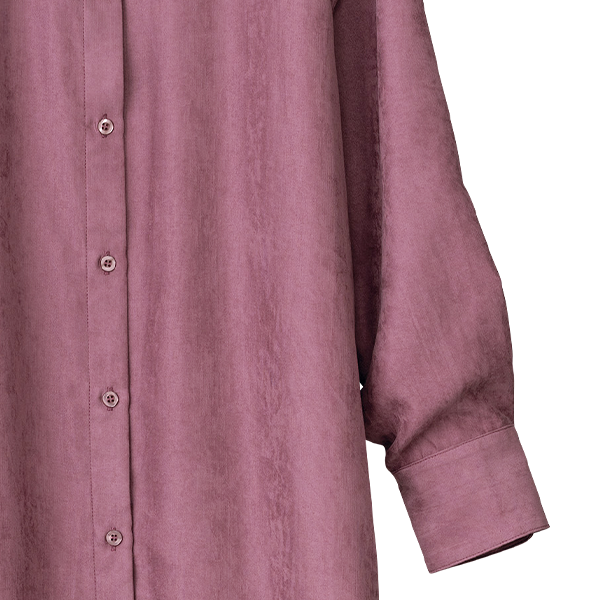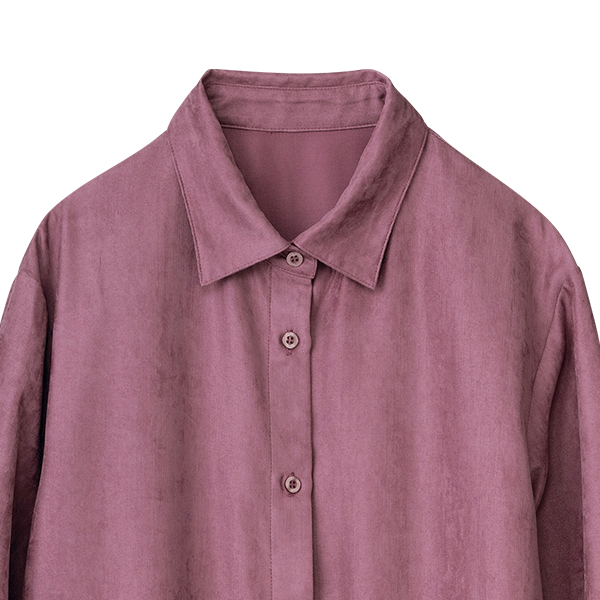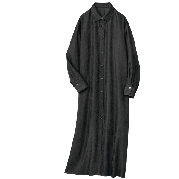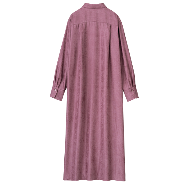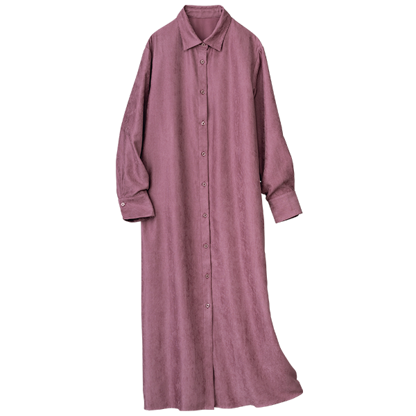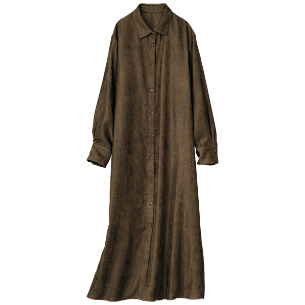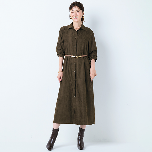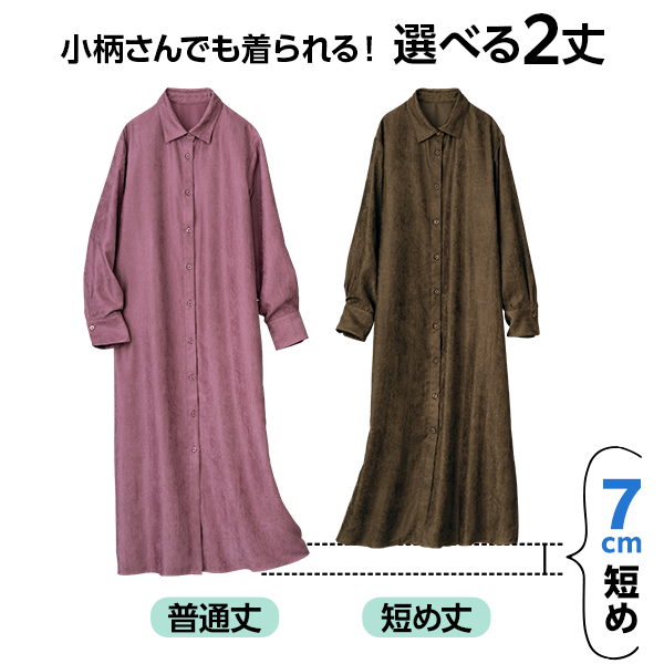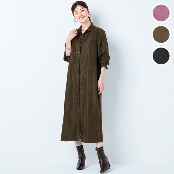 表面は起毛、内側はツヤ感があり、重ね着しても生地の滑りが良さそうです。ストレッチ性はありません。カジュアル過ぎないシャツワンピなので、肩幅を確認してサイズを選ぶと良いかもしれません。釦の開け閉めで、いろいろな着こなしが楽しめそうです。