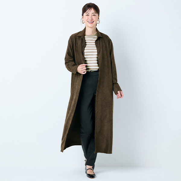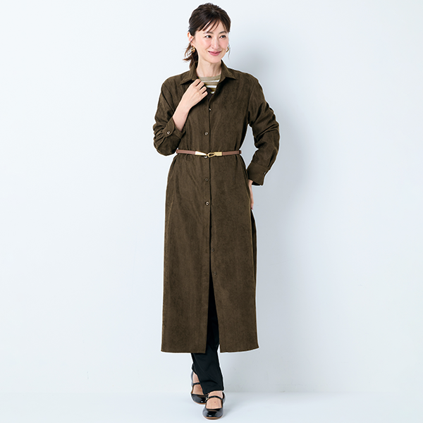薄手のコーデュロイ素材でサッと着やすい軽い生地です。丈はレギュラー丈だと少し長めだったので、短め丈でもよい感じがしました。