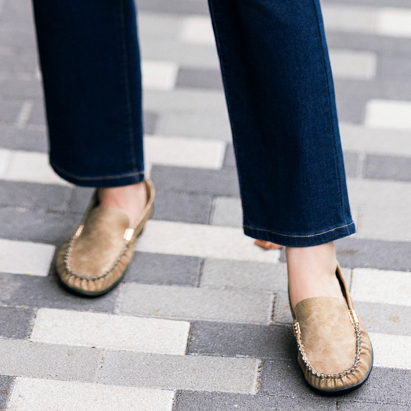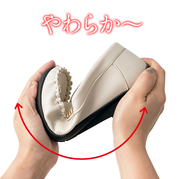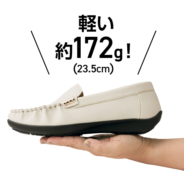 幅広のソールでゆったり履けるのに、軽くてスマート見えする大人のモカシン。取り外し可能なクッションボアインソール付きで冬の間は底冷え知らずで活躍し、春はお持ちのインソールに取り換えると通年履けます。自転車などにも乗りやすいドライビングソールなのでフラットで負担なく歩きやすいです。