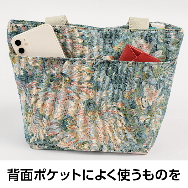 小ぶりなのにたくさん入る、繊細な花模様が上品なジャカード柄ミニバッグ。背面にはオープンポケットが2つ付いているのでスマホやカードなど、さっと取り出したいものを入れられます。大人っぽいシックな色柄でコーディネートのアクセントに。