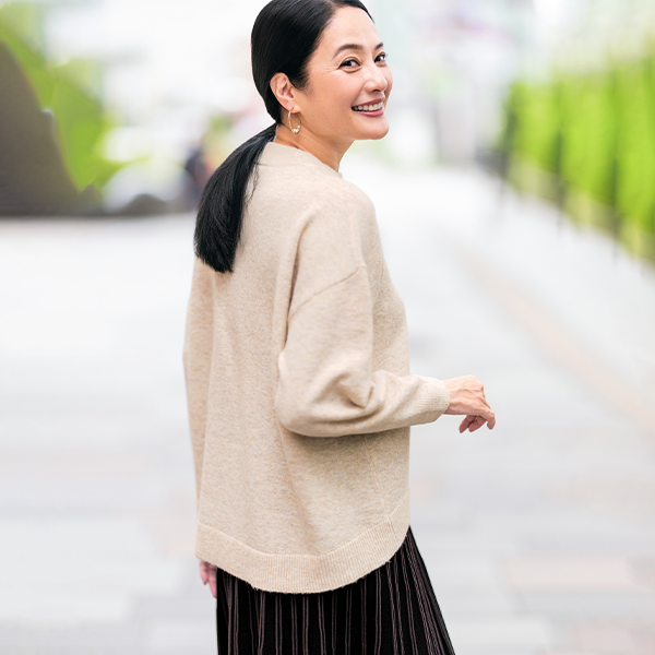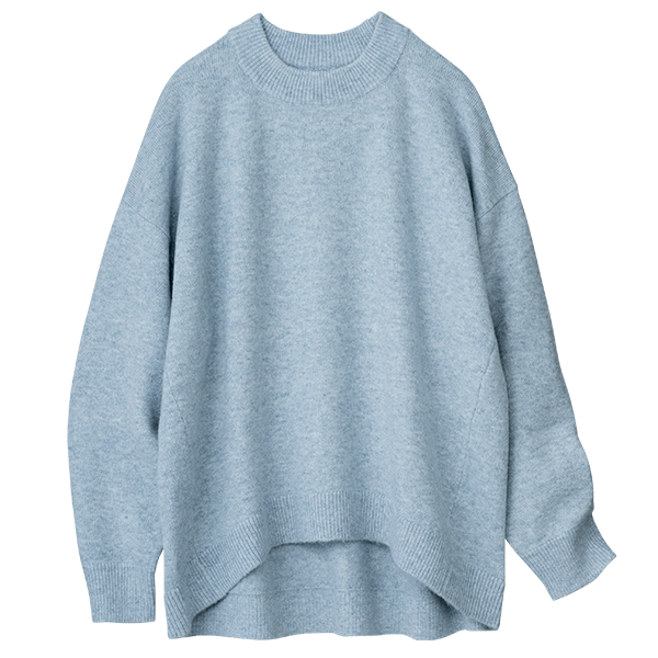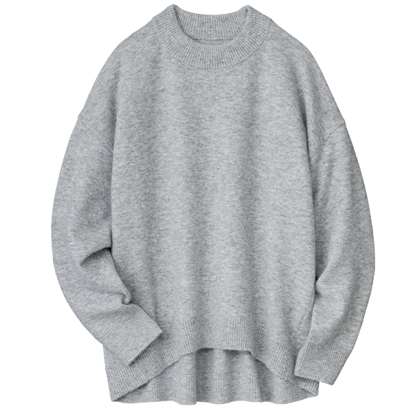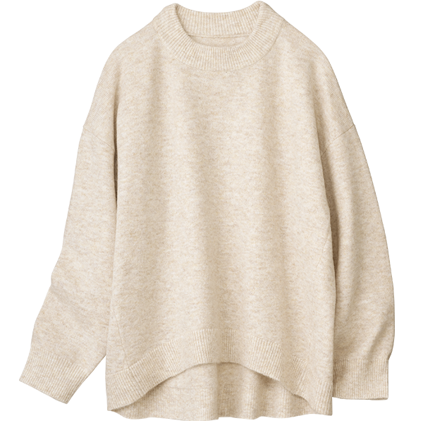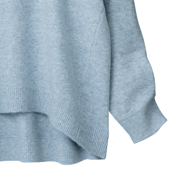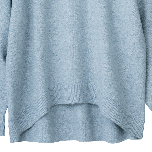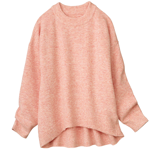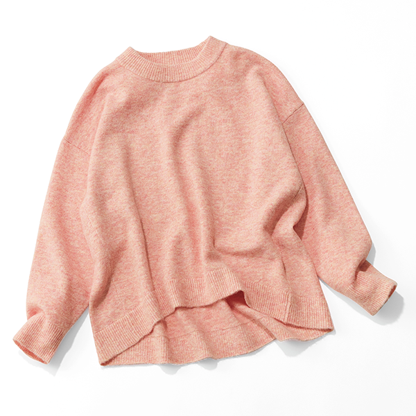 明るいメランジカラーで春まで着られるお役立ちニットです。着丈は若干短めですが、後ろが長くなっているデザインでヒップも隠れて安心です。