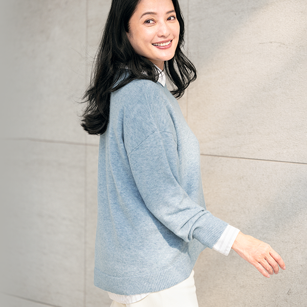 明るいメランジカラーで春まで着られるお役立ちニットです。着丈は若干短めですが、後ろが長くなっているデザインでヒップも隠れて安心です。