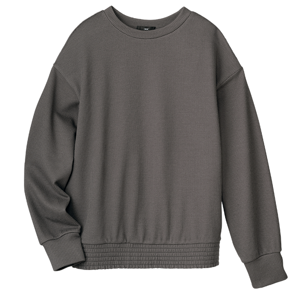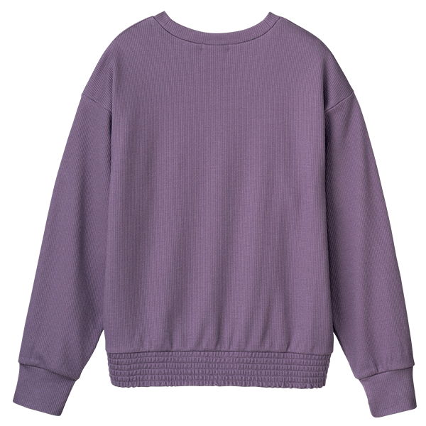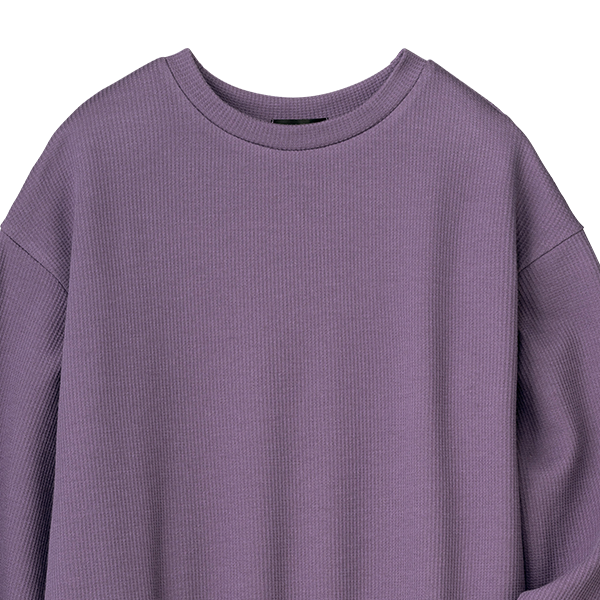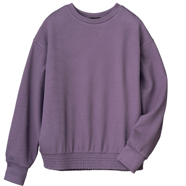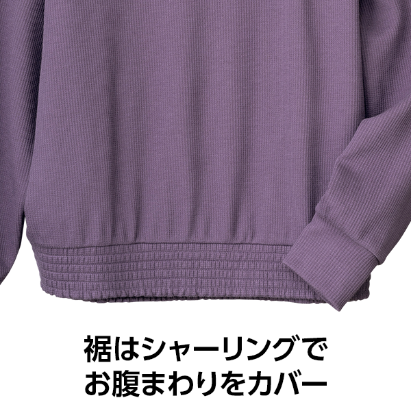 ワッフル素材のような、表面感がある素材です。Sサイズが良いです。軽くて伸びる素材なので着脱も動きも良く、窮屈ではありません。裾にゴムが入ったデザインが素敵なプルオーバーです。