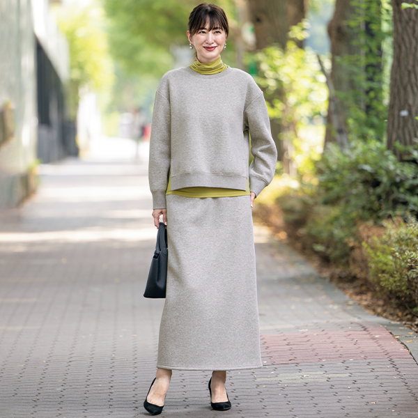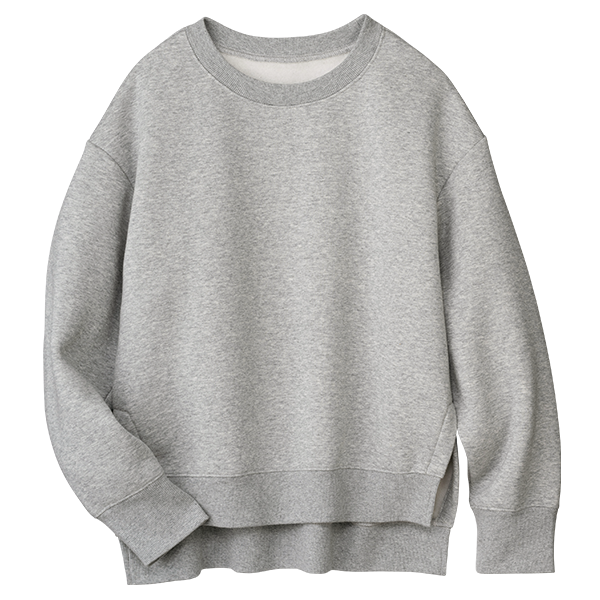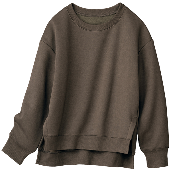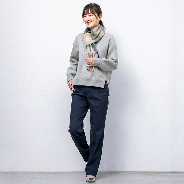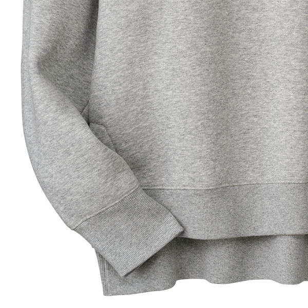 デイリーウェアとしてヘビロテしたい裏起毛のスウェットです。腰位置が高く見える身丈でスタイルアップ効果があるのがうれしいです。インナーとしてオーガニックアルガンオイル・ハニカムカットソーを着ていますが、丈のバランスがピッタリで合わせやすかったです。
