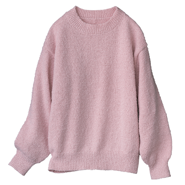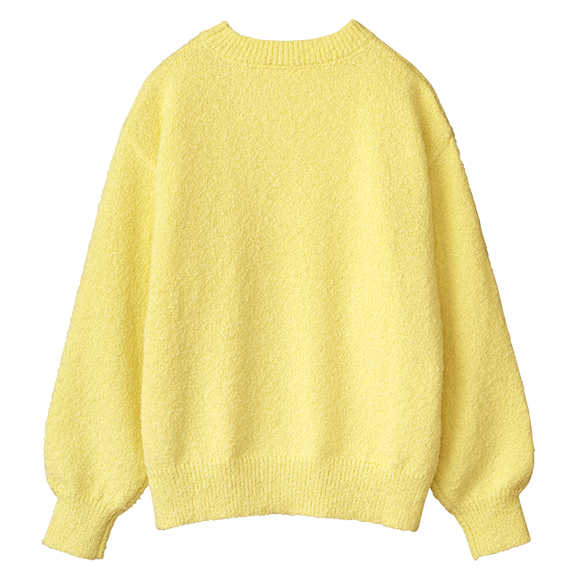 ベーシックなデザインながら、ブークレーの編み地と明るいカラーが華やかで春先まで着られます。ほんのりパフスリーブは腕をカバーしつつさりげないアクセントに。ブークレーは保温性も高く、寒がりさんでも安心です。