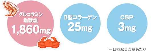 【栄養成分表示】[6粒2610mgあたり]熱量11.1kcal、たんぱく質0.81g、脂質0.19g、炭水化物1.54g、食塩相当量0.004g、グルコサミン塩酸塩1860mg、II型コラーゲン25mg、コンドロイチン硫酸10mg、CBP(濃縮乳清活性たんぱく)3mg