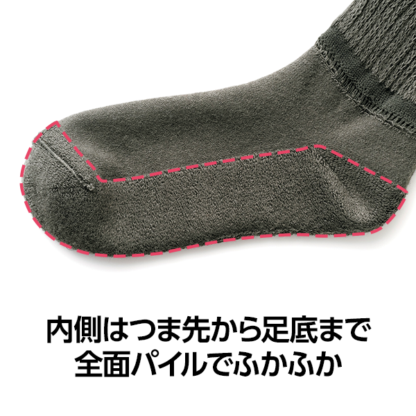 遠赤外線機能と肌側パイルで足元冷え知らずな冬用ソックス。一般的なソックスより約2.3倍あたたかいです。足首は外気を通しにくい空気をたっぷり含む2重仕立て。