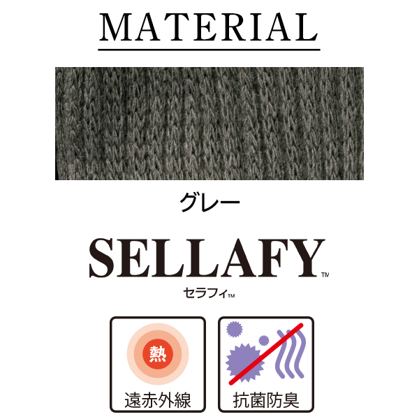• 遠赤外線放射機能糸「セラフィ<sup>™</sup>」であったか!<br>遠赤外線放射機能糸「セラフィ<sup>™</sup>」を使用。保温性に優れているため、あったかさが持続します。<br>※SELLAFY<sup>™</sup>及びセラフィ<sup>™</sup>は河辺株式会社の登録商標です。