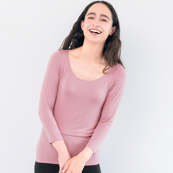 滑らかな肌触りで心地良く、ふわっと温かさを感じます。アンダーはぐるりゴムで腕の上げ下げにもズレ感がほぼなく、薄手でもたつき感もないのでインナーとして大活躍します。