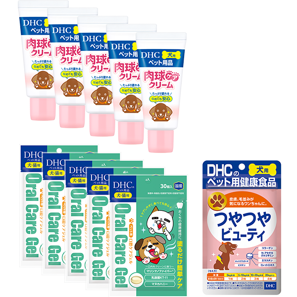 犬用 国産 肉球ケアクリーム(20g)』5個と、>『ペット用 国産 口腔ケアジェル』5個と、『犬用 国産 つやつやビューティ』1個をお得なセットにしました。