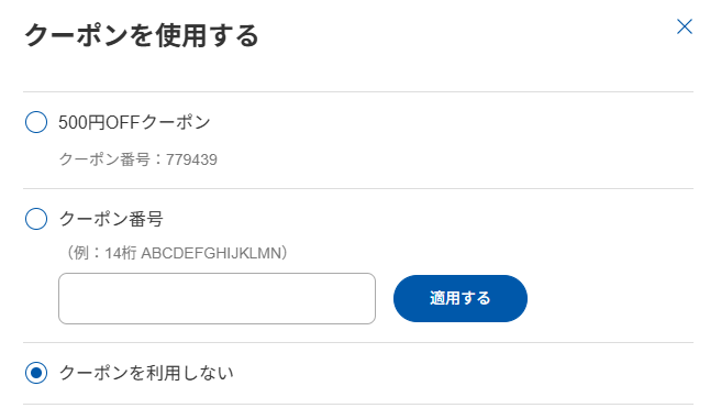 - クーポンによっては、番号入力不要で自動的にリストに表示されるものもございます。