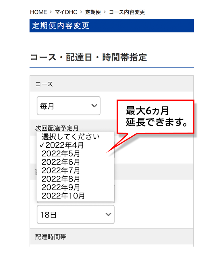 - 「定期便ギフト」にお申し込みいただいているお客様は、「マイDHC」の「定期便」より、現在のお申し込み内容が確認できます。