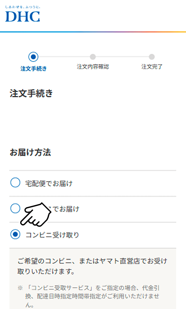 - 「コンビニ受取サービス」をご指定の場合、代金引換、配達日時指定・時間帯指定がご利用いただけません。