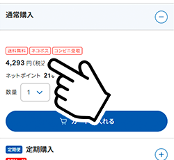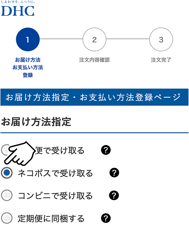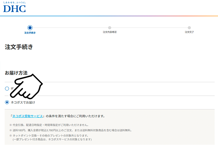 商品をカートに入れて[注文手続きへ]ボタンをクリックすると、以下のページが表示されます。[ネコポスでお届け]を選択してお進みください。